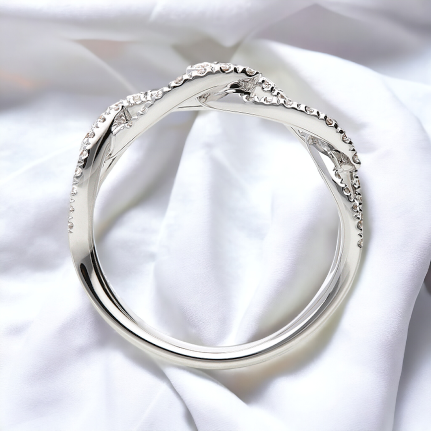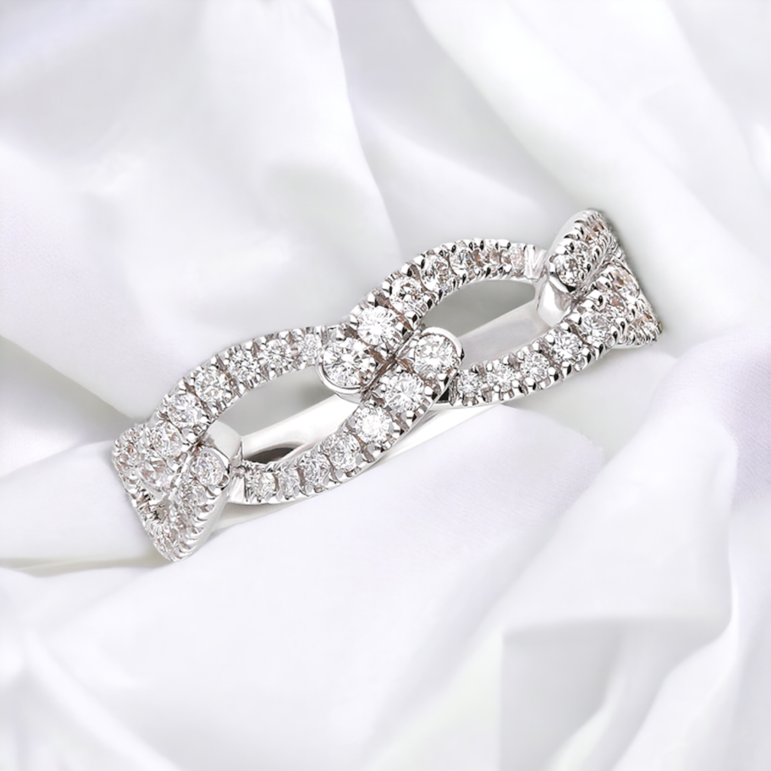 Ez a különleges 18 karátos fehéraranyból készült gyűrű 0,44 ct briliáns csiszolású gyémántot tartalmaz.
